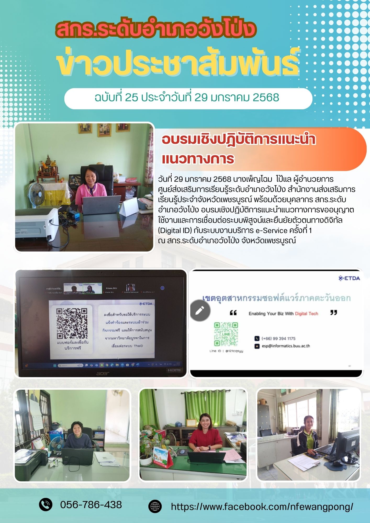 อำเภอวังโป่ง อบรมเชิงปฏิบัติการแนะนำแนวทางการขออนุญาตใช้งานและการเชื่อมต่อระบบพิสูจน์และยืนยัยตัวตนทางดิจิทัล (Digital ID) กับระบบงานบริการ e-Service ครั้งที่ 1 ณ สกร.ระดับอำเภอวังโป่ง จังหวัดเพชรบูรณ์