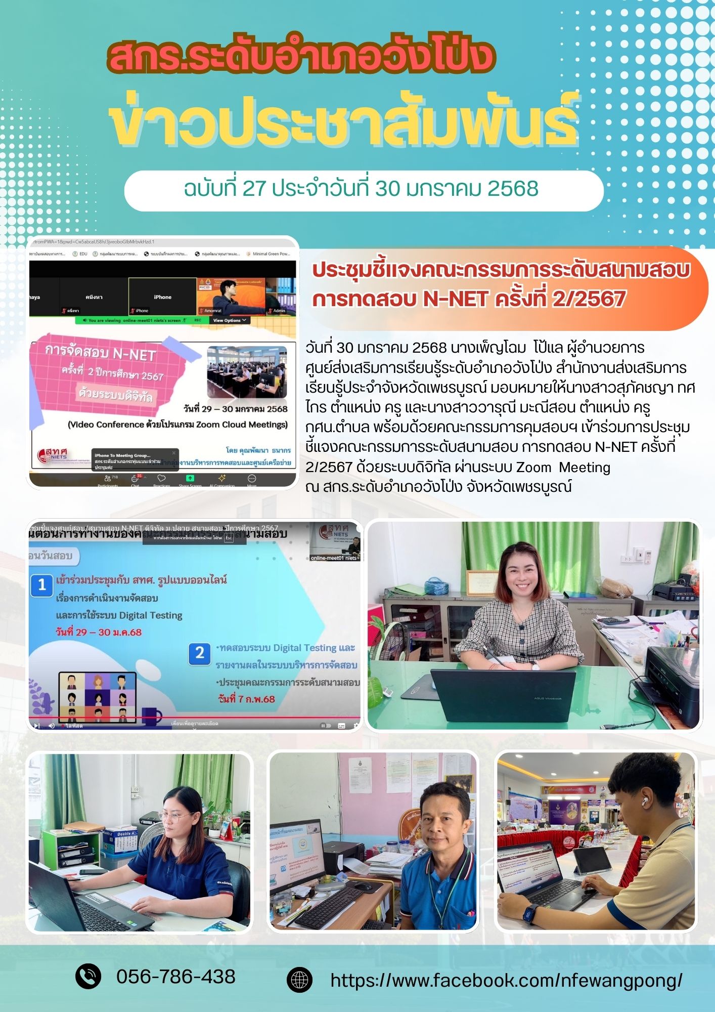 วันที่ 30 มกราคม 2568 นางเพ็ญโฉม โป้แล ผู้อำนวยการศูนย์ส่งเสริมการเรียนรู้ระดับอำเภอวังโป่ง สำนักงานส่งเสริมการเรียนรู้ประจำจังหวัดเพชรบูรณ์ มอบหมายให้นางสาวสุภัคชญา ทศไกร ตำแหน่ง ครู และนางสาววารุณี มะณีสอน ตำแหน่ง ครู กศน.ตำบล พร้อมด้วยคณะกรรมการคุมสอบฯ เข้าร่วมการประชุมชี้แจงคณะกรรมการระดับสนามสอบ การทดสอบ N-NET ครั้งที่ 2/2567 ด้วยระบบดิจิทัล ผ่านระบบ Zoom Meeting ณ สกร.ระดับอำเภอวังโป่ง จังหวัดเพชรบูรณ์