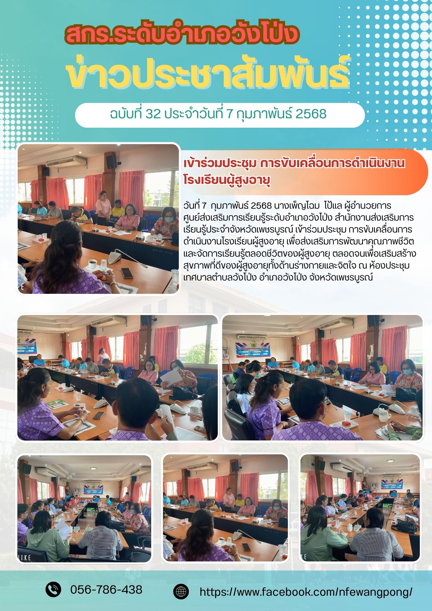 วันที่ 7 กุมภาพันธ์ 2568 นางเพ็ญโฉม โป้แล ผู้อำนวยการศูนย์ส่งเสริมการเรียนรู้ระดับอำเภอวังโป่ง สำนักงานส่งเสริมการเรียนรู้ประจำจังหวัดเพชรบูรณ์ เข้าร่วมประชุม การขับเคลื่อนการดำเนินงานโรงเรียนผู้สูงอายุ เพื่อส่งเสริมการพัฒนาคุณภาพชีวิตและจัดการเรียนรู้ตลอดชีวิตของผู้สูงอายุ ตลอดจนเพื่อเสริมสร้างสุขภาพที่ดีของผู้สูงอายุทั้งด้านร่างกายและจิตใจ ณ ห้องประชุมเทศบาลตำบลวังโป่ง อำเภอวังโป่ง จังหวัดเพชรบูรณ์