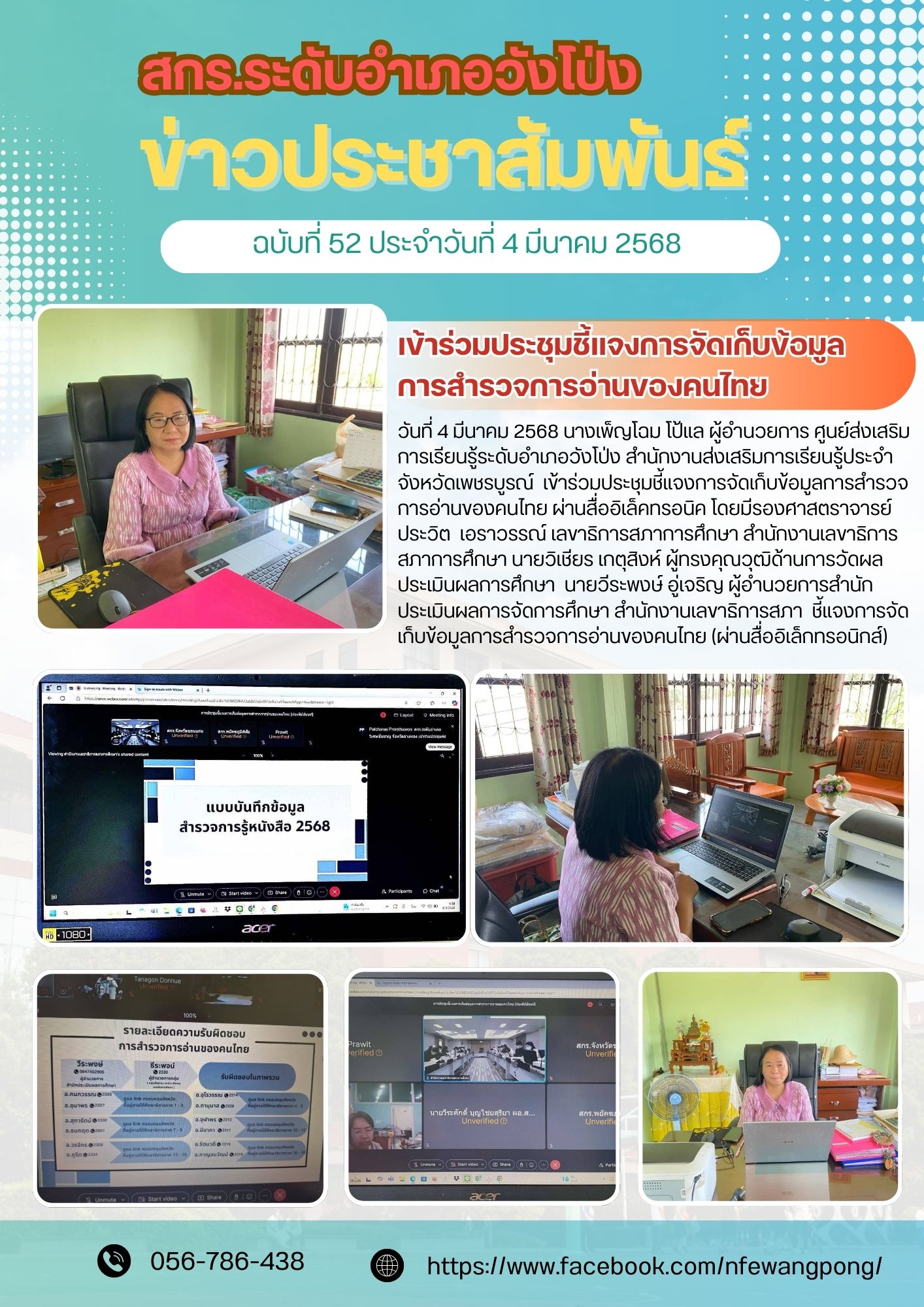 วันที่ 4 มีนาคม 2568 นางเพ็ญโฉม โป้แล ผู้อำนวยการ ศูนย์ส่งเสริมการเรียนรู้ระดับอำเภอวังโป่ง สำนักงานส่งเสริมการเรียนรู้ประจำจังหวัดเพชรบูรณ์ เข้าร่วมประชุมชี้แจงการจัดเก็บข้อมูลการสำรวจการอ่านของคนไทย ผ่านสื่ออิเล็คทรอนิค โดยมีรองศาสตราจารย์ประวิต เอราวรรณ์ เลขาธิการสภาการศึกษา สำนักงานเลขาธิการสภาการศึกษา นายวิเชียร เกตุสิงห์ ผู้ทรงคุณวุฒิด้านการวัดผลประเมินผลการศึกษา นายวีระพงษ์ อู่เจริญ ผู้อำนวยการสำนักประเมินผลการจัดการศึกษา สำนักงานเลขาธิการสภา ชี้แจงการจัดเก็บข้อมูลการสำรวจการอ่านของคนไทย (ผ่านสื่ออิเล็กทรอนิกส์)