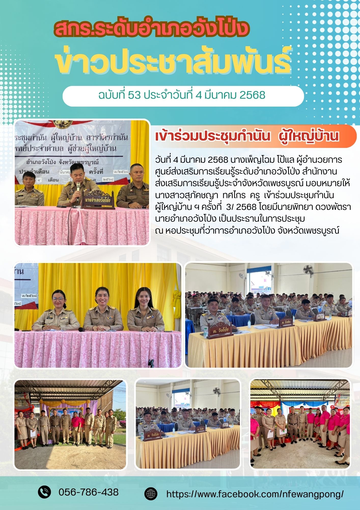 วันที่ 4 มีนาคม 2568 นางเพ็ญโฉม โป้แล ผู้อำนวยการศูนย์ส่งเสริมการเรียนรู้ระดับอำเภอวังโป่ง สำนักงานส่งเสริมการเรียนรู้ประจำจังหวัดเพชรบูรณ์ มอบหมายให้นางสาวสุภัคชญา ทศไกร ครู เข้าร่วมประชุมกำนัน ผู้ใหญ่บ้าน ฯครั้งที่ 3/ 2568 โดยมีนายพิทยา ดวงพัตรานายอำเภอวังโป่ง เป็นประธานในการประชุมณ หอประชุมที่ว่าการอำเภอวังโป่ง จังหวัดเพชรบูรณ์
