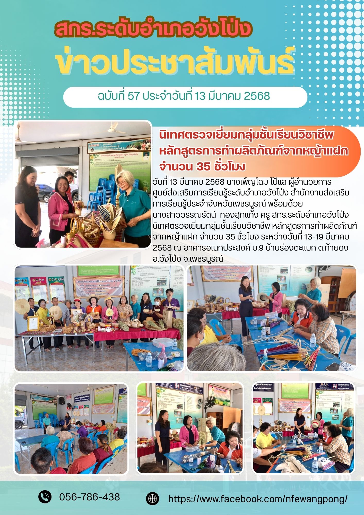วันที่ 13 มีนาคม 2568 นางเพ็ญโฉม โป้แล ผู้อำนวยการศูนย์ส่งเสริมการเรียนรู้ระดับอำเภอวังโป่ง สำนักงานส่งเสริมการเรียนรู้ประจำจังหวัดเพชรบูรณ์ พร้อมด้วยนางสาววรรณรัตน์ ทองสุกแก้ง ครู สกร.ระดับอำเภอวังโป่ง นิเทศตรวจเยี่ยมกลุ่มชั้นเรียนวิชาชีพหลักสูตรการทำผลิตภัณฑ์จากหญ้าแฝก จำนวน 35 ชั่วโมง ระหว่างวันที่ 13-19 มีนาคม 2568 ณ อาคารอเนกประสงค์ ม.9 บ้านร่องตะแบก ต.ท้ายดง อ.วังโป่ง จ.เพชรบูรณ์