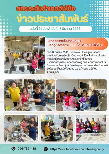 วันที่ 17 มีนาคม 2568 นางเพ็ญโฉม โป้แล ผู้อำนวยการศูนย์ส่งเสริมการเรียนรู้ระดับอำเภอวังโป่ง สำนักงานส่งเสริมการเรียนรู้ประจำจังหวัดเพชรบูรณ์ พร้อมด้วย นางสาววรรณรัตน์ ทองสุกแก้ง ครู สกร.ระดับอำเภอวังโป่ง นิเทศตรวจเยี่ยมกลุ่มสนใจ หลักสูตรการทำแหนมเห็ด จำนวน 5 ชั่วโมง ณ บ้านหนังสือชุมชน ม.3 ต.ท้ายดง อ.วังโป่ง จ.เพชรบูรณ์