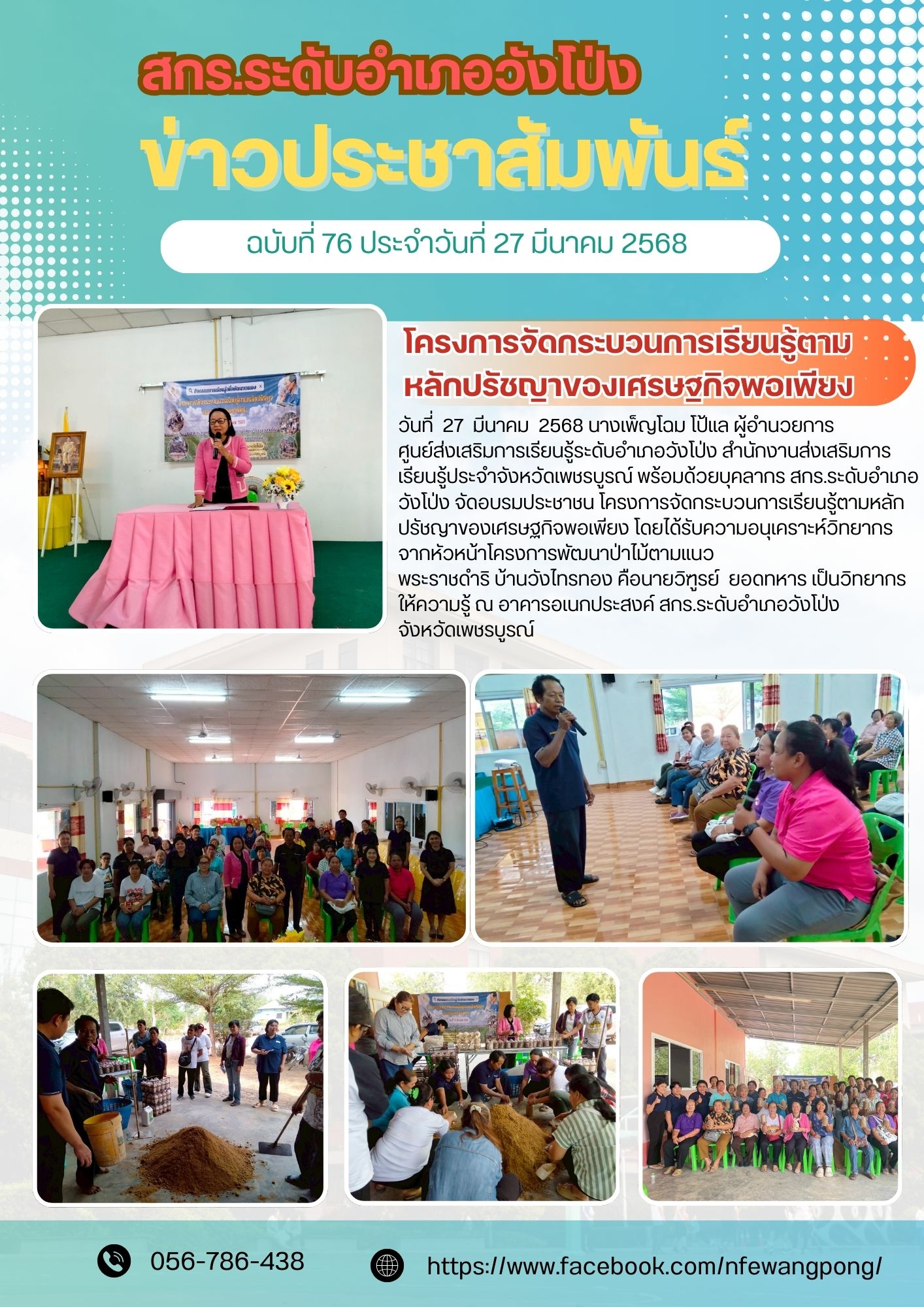 วันที่ 27 มีนาคม 2568 นางเพ็ญโฉม โป้แล ผู้อำนวยการศูนย์ส่งเสริมการเรียนรู้ระดับอำเภอวังโป่ง สำนักงานส่งเสริมการเรียนรู้ประจำจังหวัดเพชรบูรณ์ พร้อมด้วยบุคลากร สกร.ระดับอำเภอวังโป่ง จัดอบรมประชาชน โครงการจัดกระบวนการเรียนรู้ตามหลักปรัชญาของเศรษฐกิจพอเพียง โดยได้รับความอนุเคราะห์วิทยากร จากหัวหน้าโครงการพัฒนาป่าไม้ตามแนวพระราชดำริ บ้านวังไทรทอง คือนายวิฑูรย์ ยอดทหาร เป็นวิทยากรให้ความรู้ ณ อาคารอเนกประสงค์ สกร.ระดับอำเภอวังโป่ง