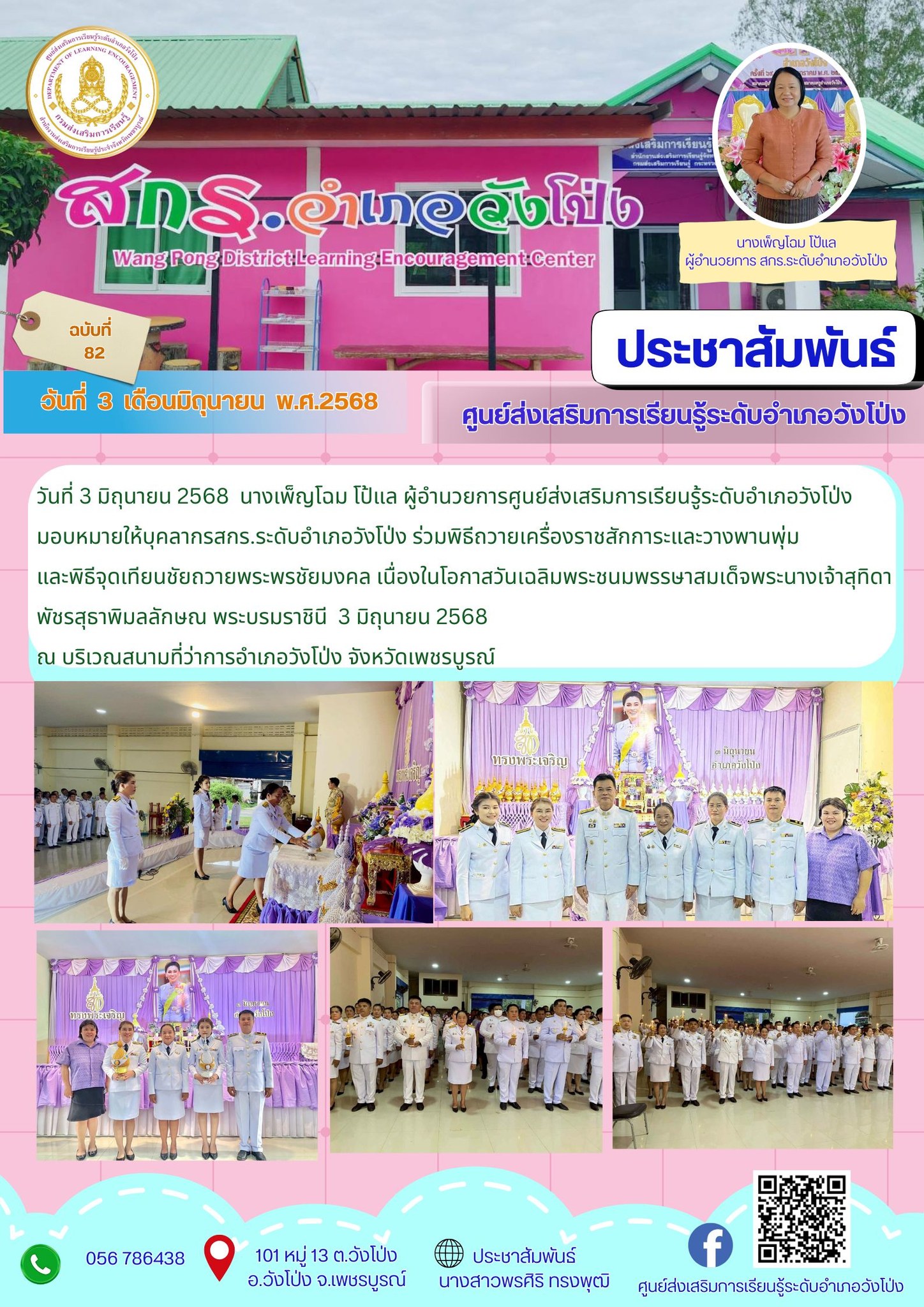 วันที่ 3 มิถุนายน 2568 นางเพ็ญโฉม โป้แล ผู้อำนวยการศูนย์ส่งเสริมการเรียนรู้ระดับอำเภอวังโป่ง มอบหมายให้บุคลากรสกร.ระดับอำเภอวังโป่ง ร่วมพิธีถวายเครื่องราชสักการะและวางพานพุ่ม และพิธีจุดเทียนชัยถวายพระพรชัยมงคล เนื่องในโอกาสวันเฉลิมพระชนมพรรษาสมเด็จพระนางเจ้าสุทิดาพัชรสุธาพิมลลักษณ พระบรมราชินี 3 มิถุนายน 2568 ณ บริเวณสนามที่ว่าการอำเภอวังโป่ง จังหวัดเพชรบูรณ์