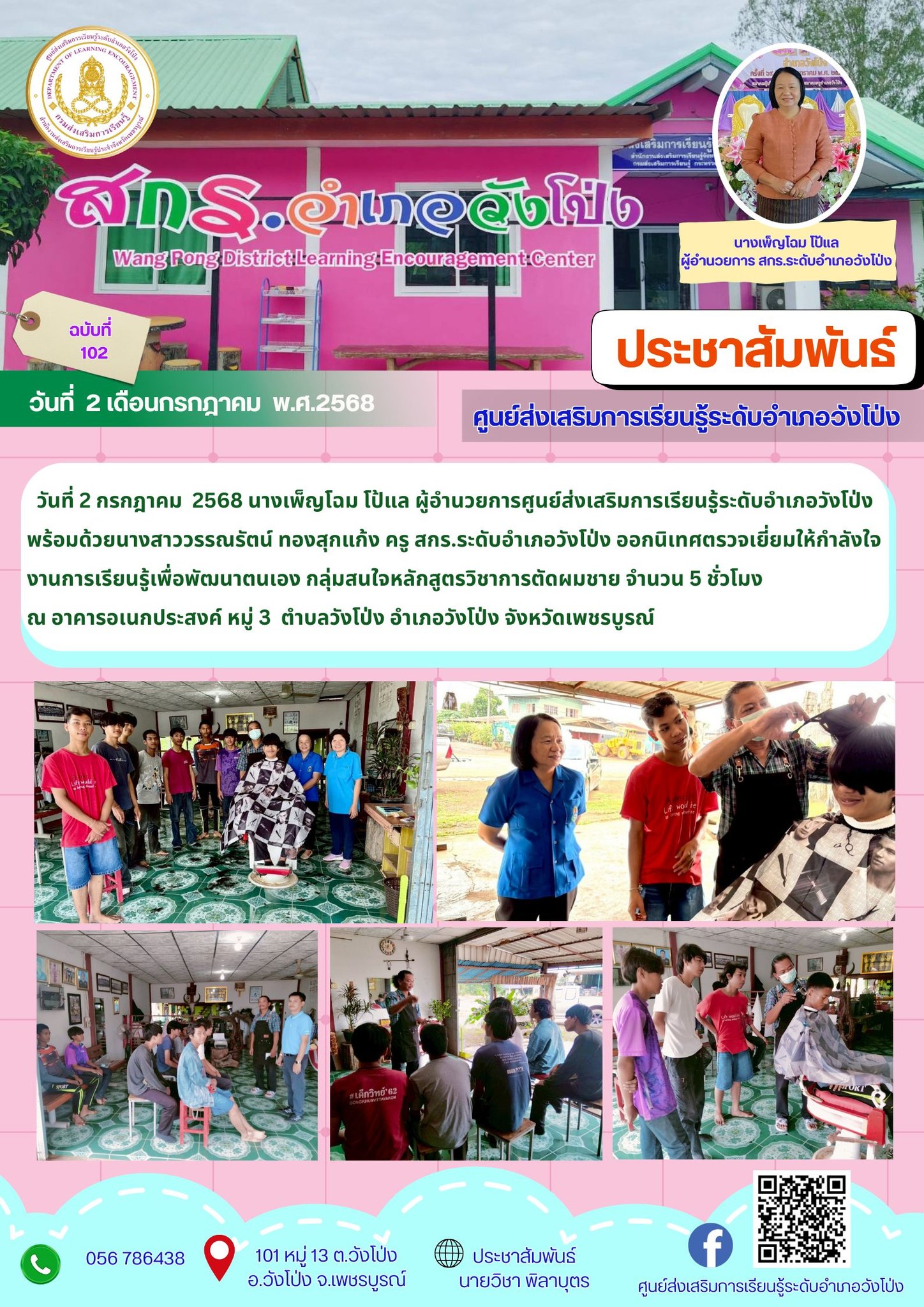 วันที่ 2 กรกฎาคม 2568 นางเพ็ญโฉม โป้แล ผู้อำนวยการศูนย์ส่งเสริมการเรียนรู้ระดับอำเภอวังโป่ง พร้อมด้วยนางสาววรรณรัตน์ ทองสุกแก้ง ครู สกร.ระดับอำเภอวังโป่ง ออกนิเทศตรวจเยี่ยมให้กำลังใจงานการเรียนรู้เพื่อพัฒนาตนเอง กลุ่มสนใจหลักสูตรวิชาการตัดผมชาย จำนวน 5 ชั่วโมง ณ อาคารอเนกประสงค์ หมู่ 3 ตำบลวังโป่ง อำเภอวังโป่ง จังหวัดเพชรบูรณ์