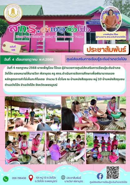 วันที่ 4 กรกฎาคม 2568 นางเพ็ญโฉม โป้แล ผู้อำนวยการศูนย์ส่งเสริมการเรียนรู้ระดับอำเภอวังโป่ง มอบหมายให้นายวิชา พิลาบุตร ครู ศกร.ดำเนินการจัดการศึกษาเพื่อพัฒานาตนเอง หลักสูตรการทำไข่เค็มกะทิใบเตย จำนวน 5 ชั่วโมง ณ บ้านหนังสือชุมชน หมู่ 10 บ้านหนังสือชุมชน ตำบลวังโป่ง อำเอวังโป่ง จังหวัดเพชรบูรณ์