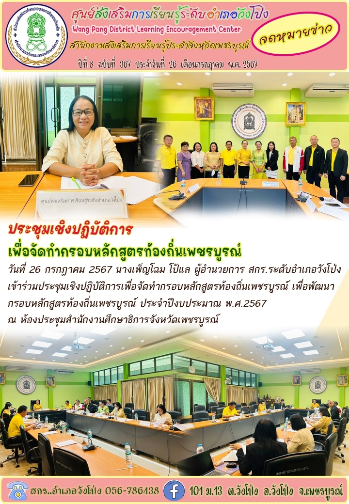 วันที่ 26 กรกฎาคม 2567 นางเพ็ญโฉม โป้แล ผู้อำนวยการศูนย์ส่งเสริมการเรียนรู้ระดับอำเภอวังโป่ง เข้าร่วมประชุมเชิงปฏิบัติการเพื่อจัดทำหลักสูตรท้องถิ่นเพชรบูรณ์ เพื่อพัฒนากรอบหลักสูตรท้องถิ่นเพชรบูรณ์ ประจำปีงบประมาณ พ.ศ.2567 ณ ห้องประชุมสำนักงานศึกษาธิการจังหวัดเพชรบูรณ์