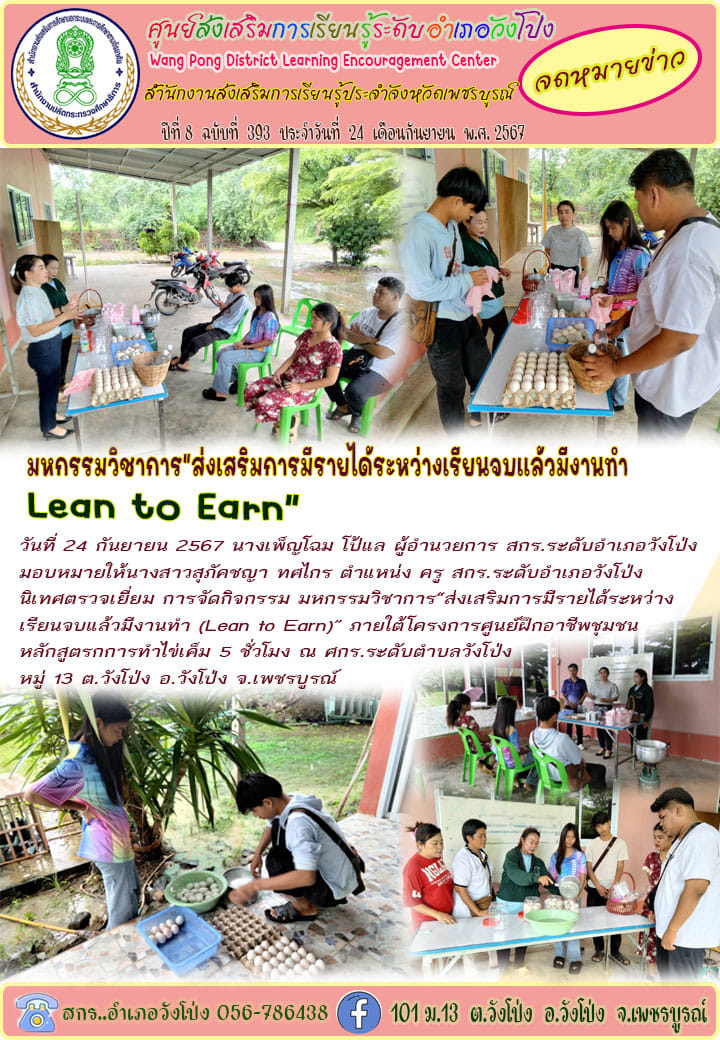 วันที่ 24 กันยายน 2567 นางเพ็ญโฉม โป้แล ผู้อำนวยการ สกร. ระดับอำเภอวังโป่ง มอบหมายให้นายวิชา พิลาบุตร ครู กศน ตำบล ดำเนินการจัดกิจกรรมการเรียนรู้เพื่อพัฒนาตนเอง รูปแบบกลุ่มสนใจ หลักสูตรการทำไข่เค็ม จำนวน 5 ชั่วโมง ภายใต้โครงการศูนย์ฝึกอาชีพชุมชน การจัดกิจกรรม มหกรรมวิชาการ “ส่งเสริมการมีรายได้ระหว่างเรียน จบแล้วมีงานทำ (Lean to Earn)” พร้อมได้รับการนิเทศติดตามจากนางสาววรรณรัตน์ ทองสุกแก้ง ตำแหน่ง ครูนางสาวสุภัคชญา ทศไกร ตำแหน่ง ครู และนางพัฒนา คำเพลิง ครูอาสาสมัครฯ