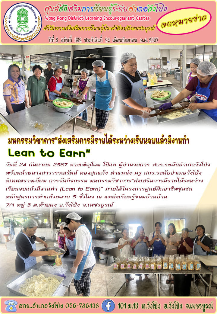 วันที่ 24 กันยายน 2567 นางเพ็ญโฉม โป้แล ผู้อำนวยการ สกร. ระดับอำเภอวังโป่ง มอบหมายให้นางสาวพรรณทิภา ด้วงนุช ครู กศน ตำบล ดำเนินการจัดกิจกรรมการเรียนรู้เพื่อพัฒนาตนเอง รูปแบบกลุ่มสนใจ หลักสูตรการทำกล้วยฉาบ จำนวน 5 ชั่วโมง ภายใต้โครงการศูนย์ฝึกอาชีพชุมชน การจัดกิจกรรม มหกรรมวิชาการ “ส่งเสริมการมีรายได้ระหว่างเรียน จบแล้วมีงานทำ (Lean to Earn)” พร้อมได้รับการนิเทศติดตามจากนางสาววรรณรัตน์ ทองสุกแก้ง ตำแหน่ง ครูนางสาวสุภัคชญา ทศไกร ตำแหน่ง ครูและนางพัฒนา คำเพลิง ครูอาสาสมัครฯ