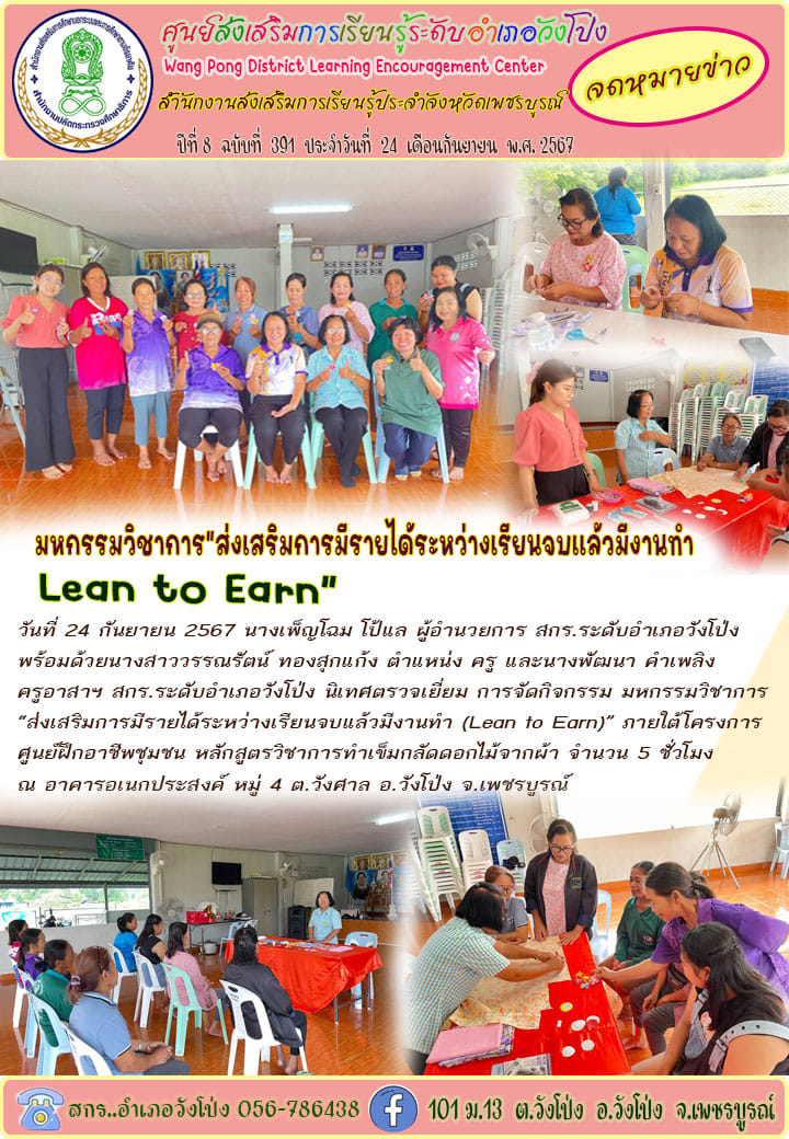 วันที่ 24 กันยายน 2567 นางเพ็ญโฉม โป้แล ผู้อำนวยการ สกร. ระดับอำเภอวังโป่ง มอบหมายให้นางสาวกาญจนา ศรีสอาด ครู กศน ตำบล ดำเนินการจัดกิจกรรมการเรียนรู้เพื่อพัฒนาตนเอง รูปแบบกลุ่มสนใจ หลักสูตรการทำเข็มกลัดดอกไม้จากผ้า จำนวน 5 ชั่วโมง ภายใต้โครงการศูนย์ฝึกอาชีพชุมชน การจัดกิจกรรม มหกรรมวิชาการ “ส่งเสริมการมีรายได้ระหว่างเรียน จบแล้วมีงานทำ (Lean to Earn)” พร้อมได้รับการนิเทศติดตามจากนางสาววรรณรัตน์ ทองสุกแก้ง ตำแหน่ง ครูนางสาวสุภัคชญา ทศไกร ตำแหน่ง ครูและนางพัฒนา คำเพลิง ครูอาสาสมัครฯ