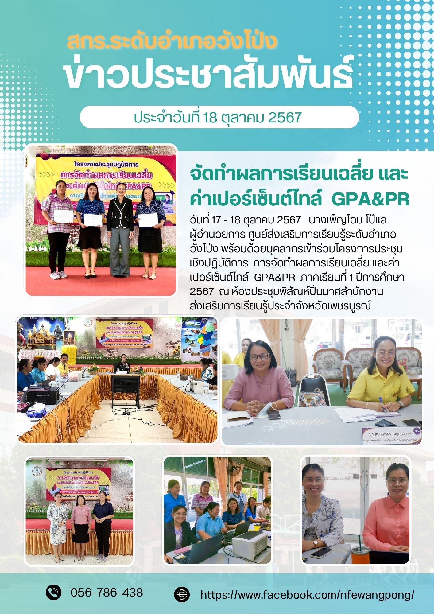 โครงการประชุมเชิงปฏิบัติการการจัดทำผลการเรียนเฉลี่ยและค่าเปอร์เซ็นไทล์ GPA&PR ภาดเรียนที่ 1 ปีการศึกษา 2567 หลักสูตรการศึกษานอกระบบระดับการศึกษาขั้นพื้นฐาน พุทธศักราช 2551 ระดับประถมศึกษา มัธยมศึกษาตอนตัน และมัธยมศึกษาตอนปลาย ระหว่างวันที่ 17-18 ตุลาคม 2567 ณ ห้องประชุมพิสัณห์ปิ่นมาศ สำนักงาน สกร.ประจำจังหวัดเพชรบูรณ์