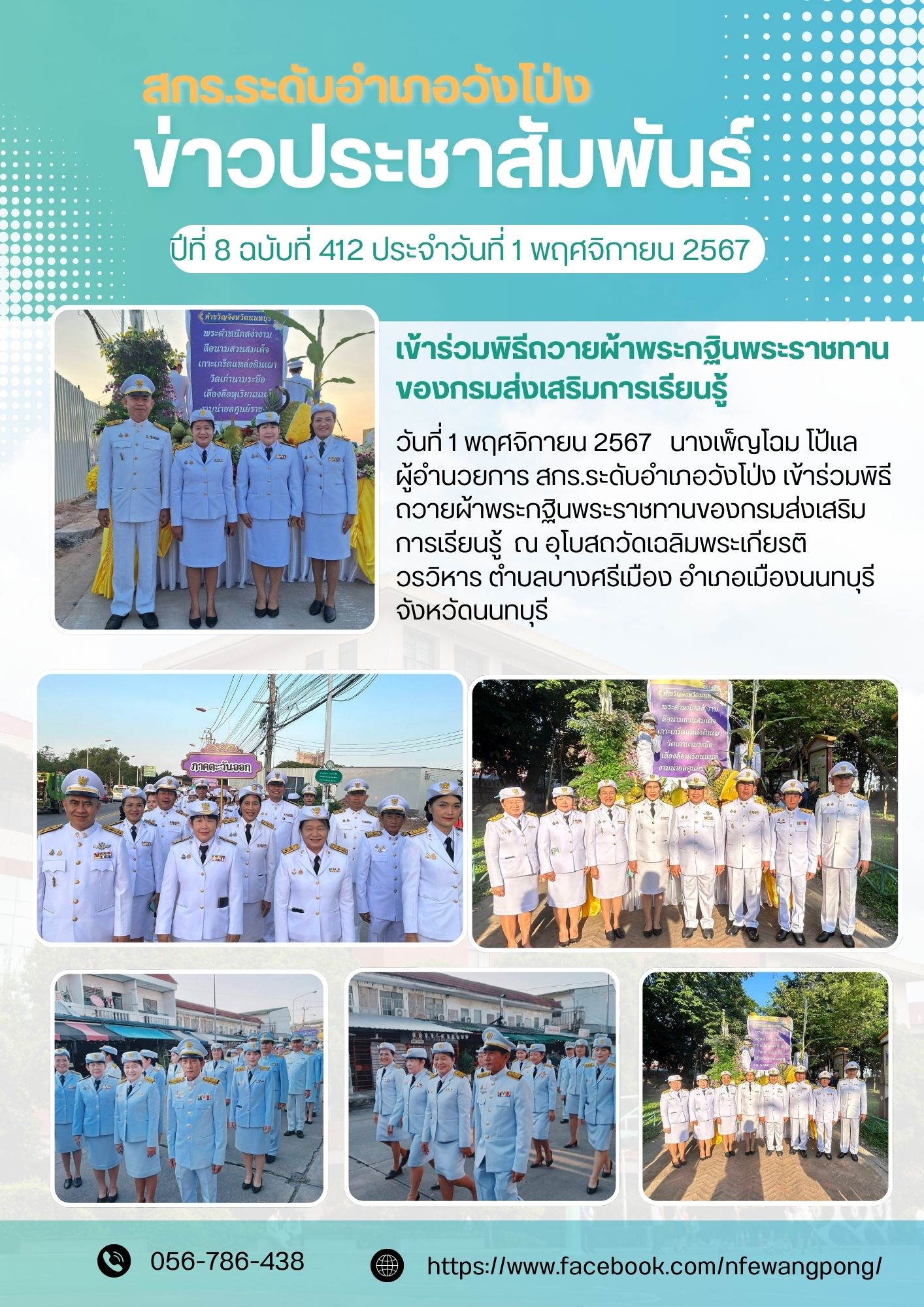 วันที่ 1 พฤศจิกายน 2567 นางเพ็ญโฉม โป้แล ผู้อำนวยการศูนย์ส่งเสริมการเรียนรู้ระดับอำเภอวังโป่ง เข้าร่วมพิธีถวายผ้าพระกฐินพระราชทานของกรมส่งเสริมการเรียนรู้ ณ อุโบสถวัดเฉลิมพระเกียรติวรวิหาร ตำบลบางศรีเมือง อำเภอเมืองนนทบุรี จังหวัดนนทบุรี