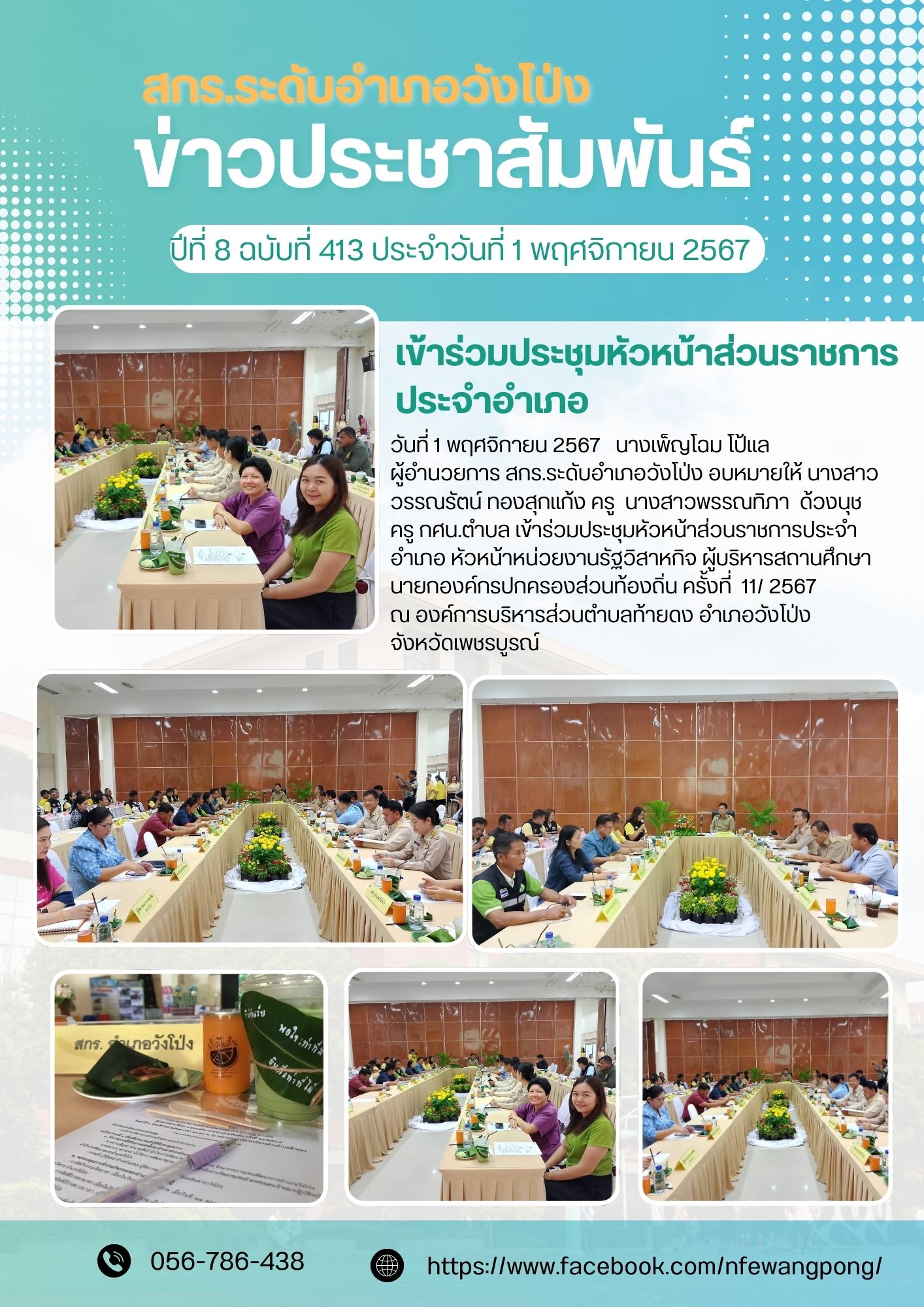 วันที่ 1 พฤศจิกายน 2567 นางเพ็ญโฉม โป้แล ผู้อำนวยการศูนย์ส่งเสริมการเรียนรู้ระดับอำเภอวังโป่ง มอบหมายให้ นางสาววรรณรัตน์ ทองสุกแก้ง ตำแหน่ง ครู นางสาวพรรณทิภา ด้วงนุช ครู กศน.ตำบล เข้าร่วมประชุมหัวหน้าส่วนราชการประจำอำเภอ หัวหน้าหน่วยงานรัฐวิสาหกิจ ผู้บริหารสถานศึกษา นายกองค์กรปกครองส่วนท้องถิ่น ครั้งที่ 11/ 2567 เวลา 13.30 น. ณ องค์การบริหารส่วนตำบลท้ายดง อำเภอวังโป่งจังหวัดเพชรบูรณ์