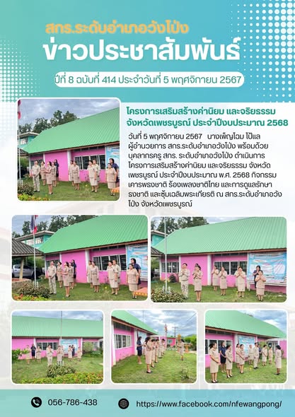 วันที่ 5 พฤศจิกายน 2567 นางเพ็ญโฉม โป้แล ผู้อำนวยการศูนย์ส่งเสริมการเรียนรู้ระดับอำเภอวังโป่ง พร้อมด้วยบุคลากร ครู สกร.ระดับอำเอวังโป่ง ดำเนินการโครงการเสริมสร้างค่านิยม และจริยธรรม จังหวัดเพชรบูรณ์ ประจำปีงบประมาณ พ.ศ.2568 กิจกรรมเคารพธงชาติ ร้องเพลงชาติไทยและการดูแลรักษาธงชาติ และซุ้มเฉลิมพระเกียรติ ณ สกร.ระดับอำเภอวังโป่ง จังหวัดเพชรบูรณ์