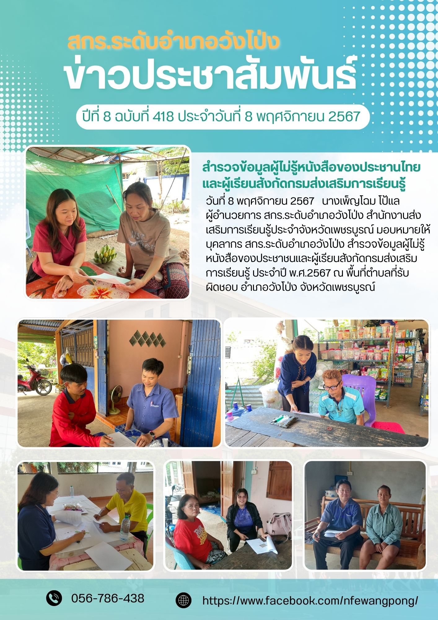 วันที่ 8 พฤศจิกายน 2567 นางเพ็ญโฉม โป้แล ผู้อำนวยการ สกร.ระดับอำเภอวังโป่ง สำนักงานส่งเสริมการเรียนรู้ประจำจังหวัดเพชรบูรณ์ มอบหมายให้บุคลากร สกร.ระดับอำเภอวังโป่ง สำรวจข้อมูลผู้ไม่รู้หนังสือของประชาชนและผู้เรียนสังกัดกรมส่งเสริมการเรียนรู้ ประจำปี พ.ศ.2567 ณ พื้นที่รับผิดชอบ อำเภอวังโป่ง จังหวัดเพชรบูรณ์