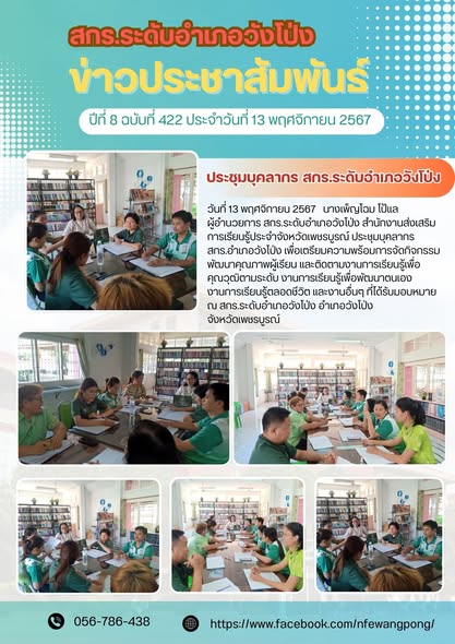 วันที่ 13 พฤศจิกายน 2567 นางเพ็ญโฉม โป้แล ผู้อำนวยการ สกร.ระดับอำเภอวังโป่ง สำนักงานส่งเสริมการเรียนรู้ประจำจังหวัดเพชรบูรณ์ ประชุมบุคลากร สกร.ระดับอำเภอวังโป่ง เพื่อเตรียมความพร้อมการจัดกิจกรรมพัฒนาคุณภาพผู้เรียน และติดตามงานการเรียนรู้เพื่อคุณวุฒิตามระดับงานการเรียนรู้เพื่อพัฒนาตนเอง งานการเรียนรู้ตลอดชีวิต และงานอื่นๆที่รับได้รับมอบหมาย ณ สกร.ระดับอำเภอวังโป่ง อำเภอวังโป่ง จังหวัดเพชรบูรณ์