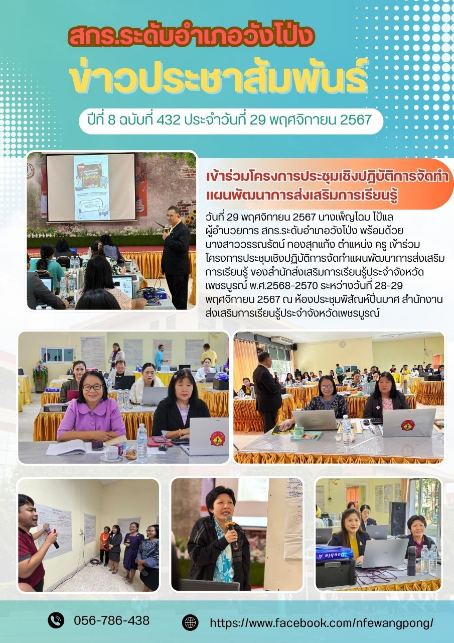 ระหว่างวันที่ 28 – 29 พฤศจิกายน 2567 นางเพ็ญโฉม โป้แล ผู้อำนวยการ สกร.ระดับอำเภอวังโป่ง และนางสาววรรณรัตน์ ทองสุกแก้ง ครู เข้าร่วมโครงการประชุมเชิงปฏิบัติการจัดทำแผนพัฒนาการส่งเสริมการเรียนรู้ ของสำนักงาน ส่งเสริมการเรียนรู้ประจำจังหวัดเพชรบูรณ์ พ.ศ.2568 - 2570 ณ ห้องพิสัณห์ปิ่นมาศ สำนักงาน สกร.ประจำจังหวัดเพชรบูรณ์ อำเภอเมือง จังหวัดเพชรบูรณ์