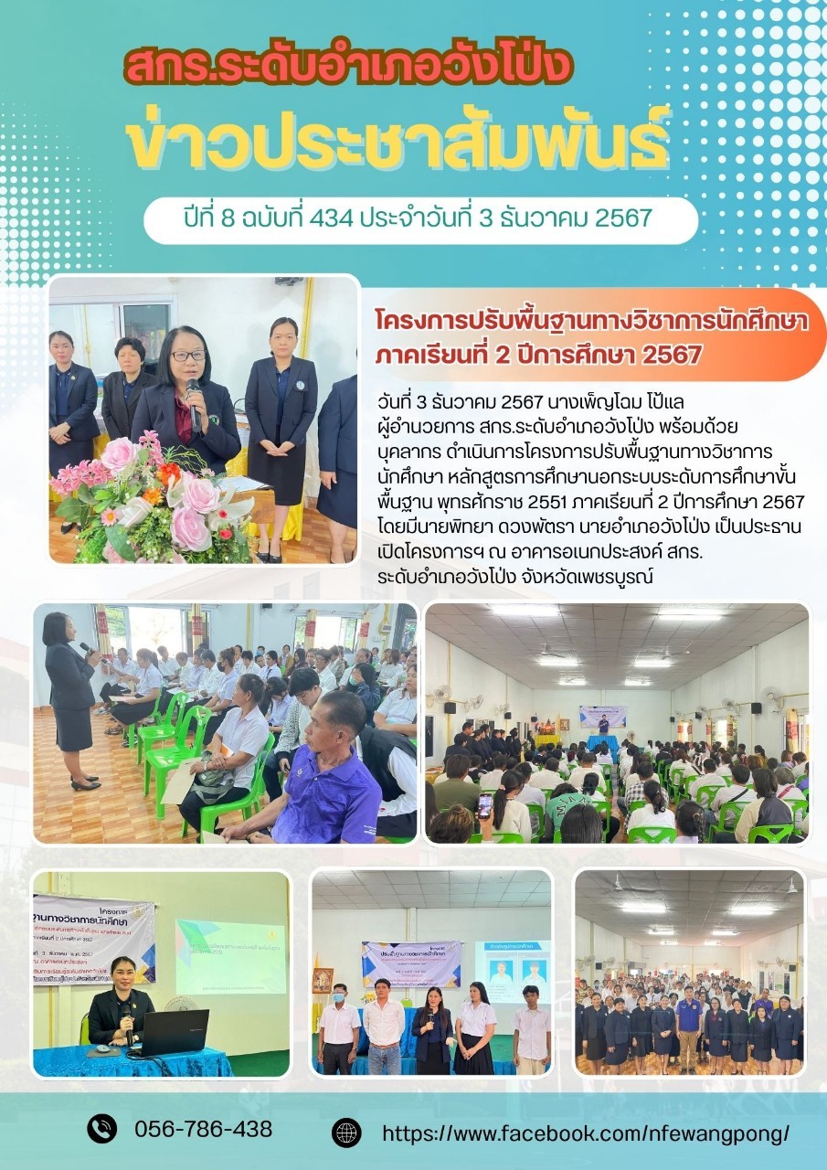 วันที่ 3 ธันวาคม 2567 ศูนย์ส่งเสริมการเรียนรู้ระดับอำเภอวังโป่ง ดำเนินการจัดกิจกรรมพัฒนาคุณภาพผู้เรียน โครงการปรับพื้นฐานทางวิชาการ หลักสูตรการศึกษานอกระบบระดับการศึกษาขั้นพื้นฐาน พุทธศักราช 2551 ณ อาคารอเนกประสงค์ สกร.ระดับอำเภอวังโป่ง จังหวัดเพชรบูรณ์