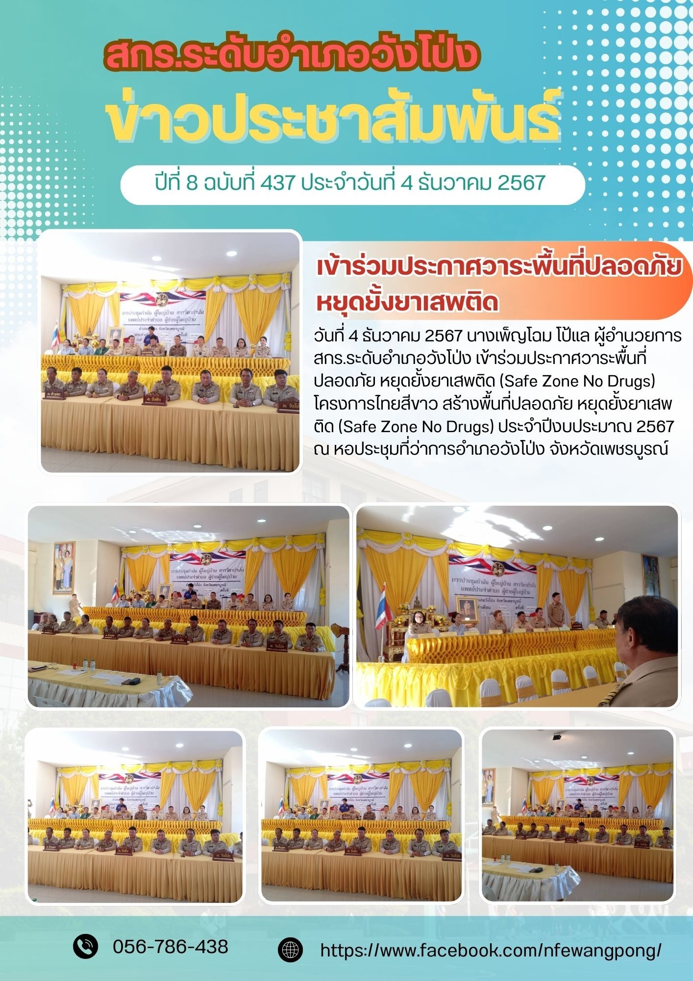 วันที่ 4 ธันวาคม 2567 นางเพ็ญโฉม โป้แล ตำแหน่ง ผู้อำนวยการศูนย์ส่งเสริมการเรียนรู้ระดับอำเภอวังโป่ง เข้าร่วมประกาศวาระพื้นที่ปลอดภัย หยุดยั้งยาเสพติด (Safe Zone No Drugs)โครงการไทยสีขาว สร้างพื้นที่ปลอดภัย หยุดยั้งยาเสพติด (Safe Zone No Drugs) ประจำปีงบประมาณ ๒๕๖๗ ณ หอประชุมที่ว่าการอำเภอวังโป่ง จังหวัดเพชรบูรณ์