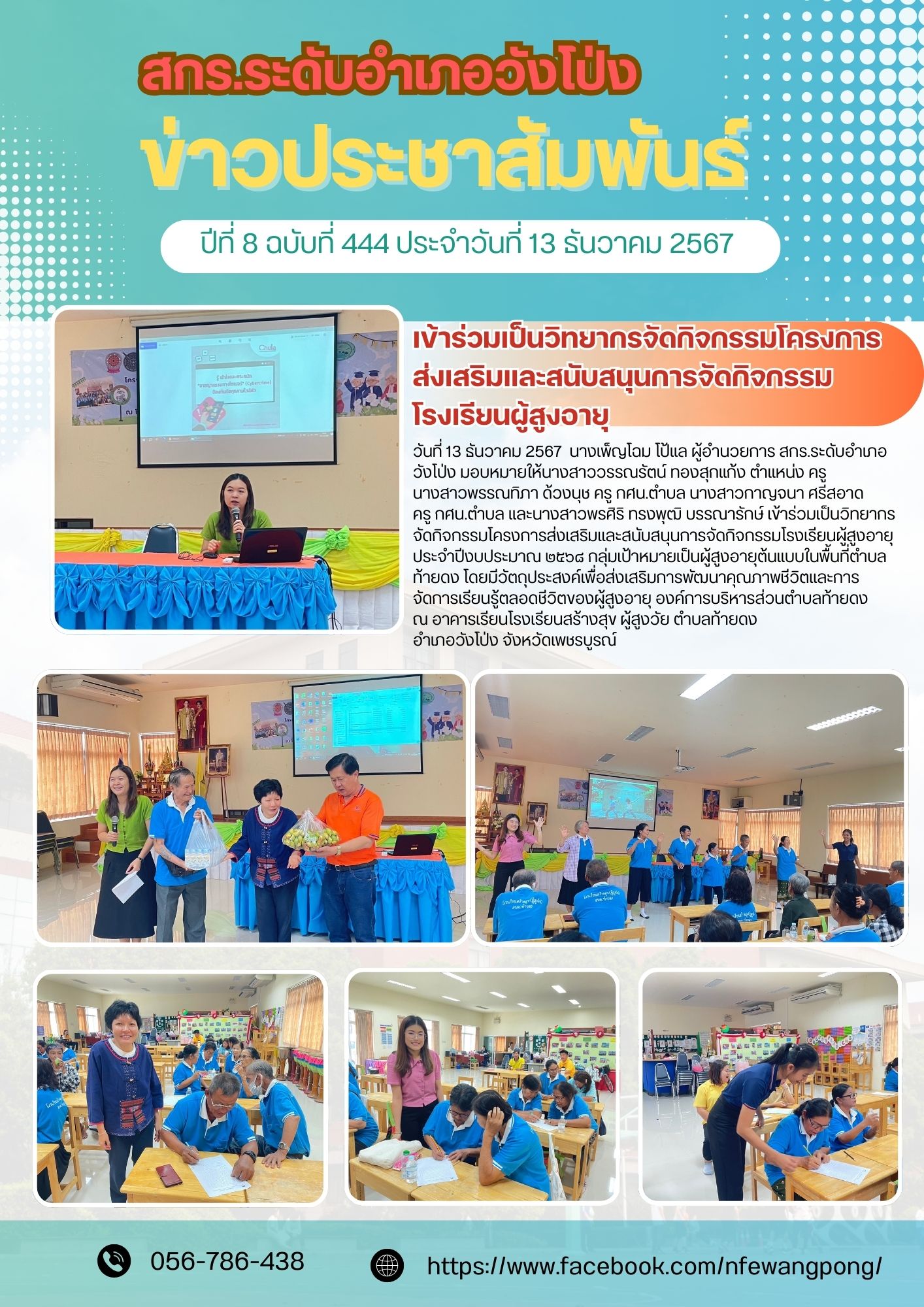 ในวันที่ 13 ธันวาคม 2567 นางเพ็ญโฉม โป้แล ผู้อำนวยการ สกร.ระดับอำเภอวังโป่ง ได้มอบหมายให้ นางสาววรรณรัตน์ ทองสุกแก้ง ตำแหน่ง ครู นางสาวพรรณทิภา ด้วงนุช ครู กศน.ตำบล นางสาวกาญจนา ศรีสอาด ครูกศน.ตำบล และนางสาวพรศิริ ทรงพุฒิ บรรณารักษ์ เข้าร่วมเป็นวิทยากรจัดกิจกรรมโครงการส่งเสริมและสนับสนุนการจัดกิจกรรมโรงเรียนผู้สูงอายุ ประจำปีงบประมาณ ๒๕๖๘ กลุ่มเป้าหมายเป็นผู้สูงอายุต้นแบบในพื้นที่ตำบลท้ายดง โดยมีวัตถุประสงค์เพื่อส่งเสริมการพัฒนาคุณภาพชีวิตและการจัดการเรียนรู้ตลอดชีวิตของผู้สูงอายุ องค์การบริหารส่วนตำบลท้ายดง ณ อาคารเรียนโรงเรียนสร้างสุขผู้สูงวัย ตำบลท้ายดง อำเภอวังโป่ง จังหวัดเพชรบูรณ์