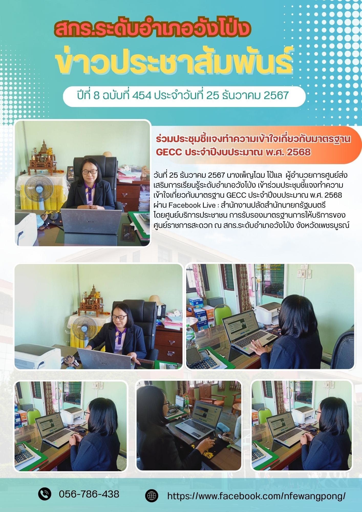 วันที่ 25 ธันวาคม 2567 นางเพ็ญโฉม โป้แล ผู้อำนวยการศูนย์ส่งเสริมการเรียนรู้ระดับอำเภอวังโป่ง เข้าร่วมประชุมชี้แจงทำความเข้าใจเกี่ยวกับมาตราฐาน GECC ประจำปีงบประมาณ พ.ศ.2568 ผ่าน Facebook Live : สำนักงานปลัดสำนักนายกรัฐมนตรี โดยศูนย์บริการประชาชน การรับรองมาตราฐานการให้บริการของศูนย์ราชการสะดวก