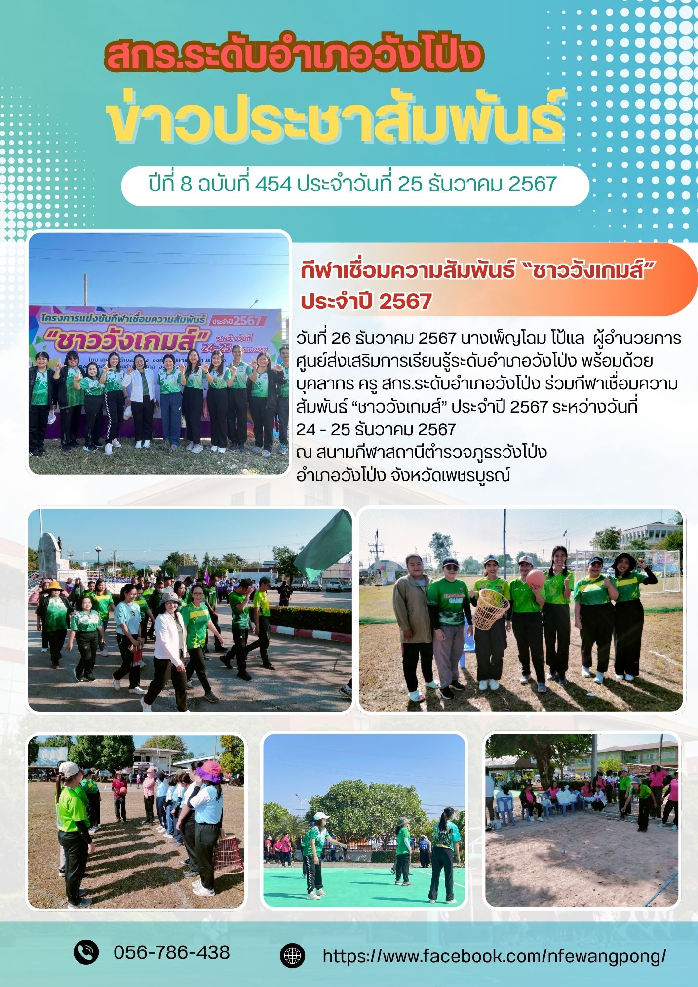 วันที่ 26 ธันวาคม 2567 นางเพ็ญโฉม โป้แล ผู้อำนวยการศูนย์ส่งเสริมการเรียนรู้ระดับอำเภอวังโป่ง พร้อมด้วยบุคลากร ครู สกร.ระดับอำเภอวังโป่ง ร่วมกีฬาเชื่อมความสัมพันธ์ “ชาววังเกมส์” ประจำปี 2567 ระหว่างวันที่