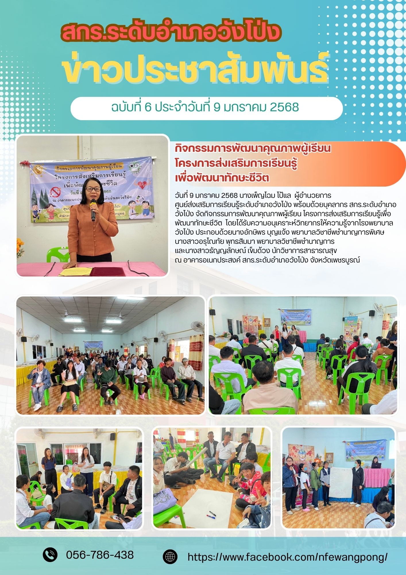 วันที่ 9 มกราคม 2568 นางเพ็ญโฉม โป้แล ผู้อำนวยการศูนย์ส่งเสริมการเรียนรู้ระดับอำเภอวังโป่ง พร้อมด้วยบุคลากร สกร.ระดับอำเภอวังโป่ง ดำเนินจัดกิจกรรมพัฒนาคุณภาพผู้เรียน โครงการส่งเสริมการเรียนรู้เพื่อพัฒนาทักษะชีวิต โดยได้รับความอนุเคราะห์วิทยากรให้ความรู็จากโรงพยาบาลวังโป่ง ประกอบด้วย นางอักษิพร บุญแจ้ง พยาบาลวิชาชีพชำนาญพิเศษ นางสาวอรุโณทัย พุทธสิมมา พยาบาลวิชาชีพชำนาญการ และนางสาวธัญญลักษณ์ เข็มด้วง นักวิชาการสาธารณสุข ณ อาคารอเนกประสงค์ สกร.ระดับอำเภอวังโป่ง จังหวัดเพชรบูรณ์