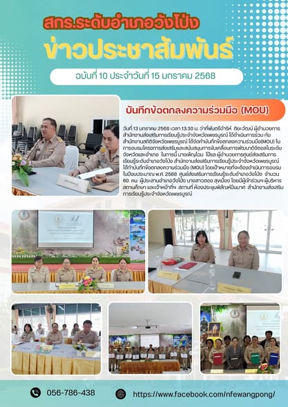 วันที่ 13 มกราคม 2568 เวลา 13:30 น. ว่าที่พันตรีดำริห์ ติยะวัฒน์ ผู้อำนวยการสำนักงานส่งเสริมการเรียนรู้ประจำจังหวัดเพชรบูรณ์ ได้ดำเนินการร่วม กับ สำนักงานสถิติจังหวัดเพชรบูรณ์ ได้จัดทำบันทึกข้อตกลงความร่วมมือ(MOU) ในการอบรมโครงการส่งเสริมและสนับสนุนการขับเคลื่อนการพัฒนาดิจิตอลในระดับจังหวัดและอำเภอ ในการนี้ นางเพ็ญโฉม โป้แล ผู้อำนวยการศูนย์ส่งเสริมการเรียนรู้ระดับอำเภอวังโป่ง สำนักงานส่งเสริมการเรียนรู้ประจำจังหวัดเพชรบูรณ์ ได้ทำบันทึกข้อตกลงความร่วมมือ (MOU) โดยเป้าหมายที่จะต้องดำเนินการอบรมในปีงบประมาณ พ.ศ. 2568 ศูนย์ส่งเสริมการเรียนรู้ระดับอำเภอวังโป่ง จำนวน 60 คน ผู้ประสานอำเภอวังโป่ง นางสาวตอง สุขเมือง โดยมีผู้เข้าร่วมฯ ผู้บริหารสถานศึกษา และเจ้าหน้าที่ฯ สถานที่ ห้องประชุมพิสัณห์ปิ่นมาศ สำนักงานส่งเสริมการเรียนรู้ประจำจังหวัดเพชรบูรณ์