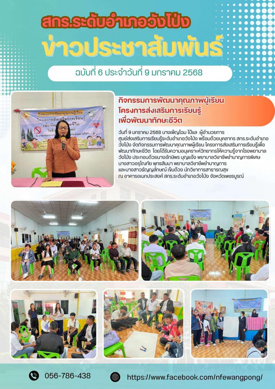 วันที่ 9 มกราคม 2568 นางเพ็ญโฉม โป้แล ผู้อำนวยการศูนย์ส่งเสริมการเรียนรู้ระดับอำเภอวังโป่ง พร้อมด้วยบุคลากร สกร.ระดับอำเภอวังโป่ง ดำเนินการจัดกิจกรรมการพัฒนาคุณภาพผู้เรียน โครงการส่งเสริมการเรียนรู้เพื่อพัฒนาทักษะชีวิต ให้นักศึกษา สกร.ระดับอำเภอวังโป่ง โดยได้รับความอนุเคราะห์วิทยากรจากโรงพยาบาลวังโป่ง คือ