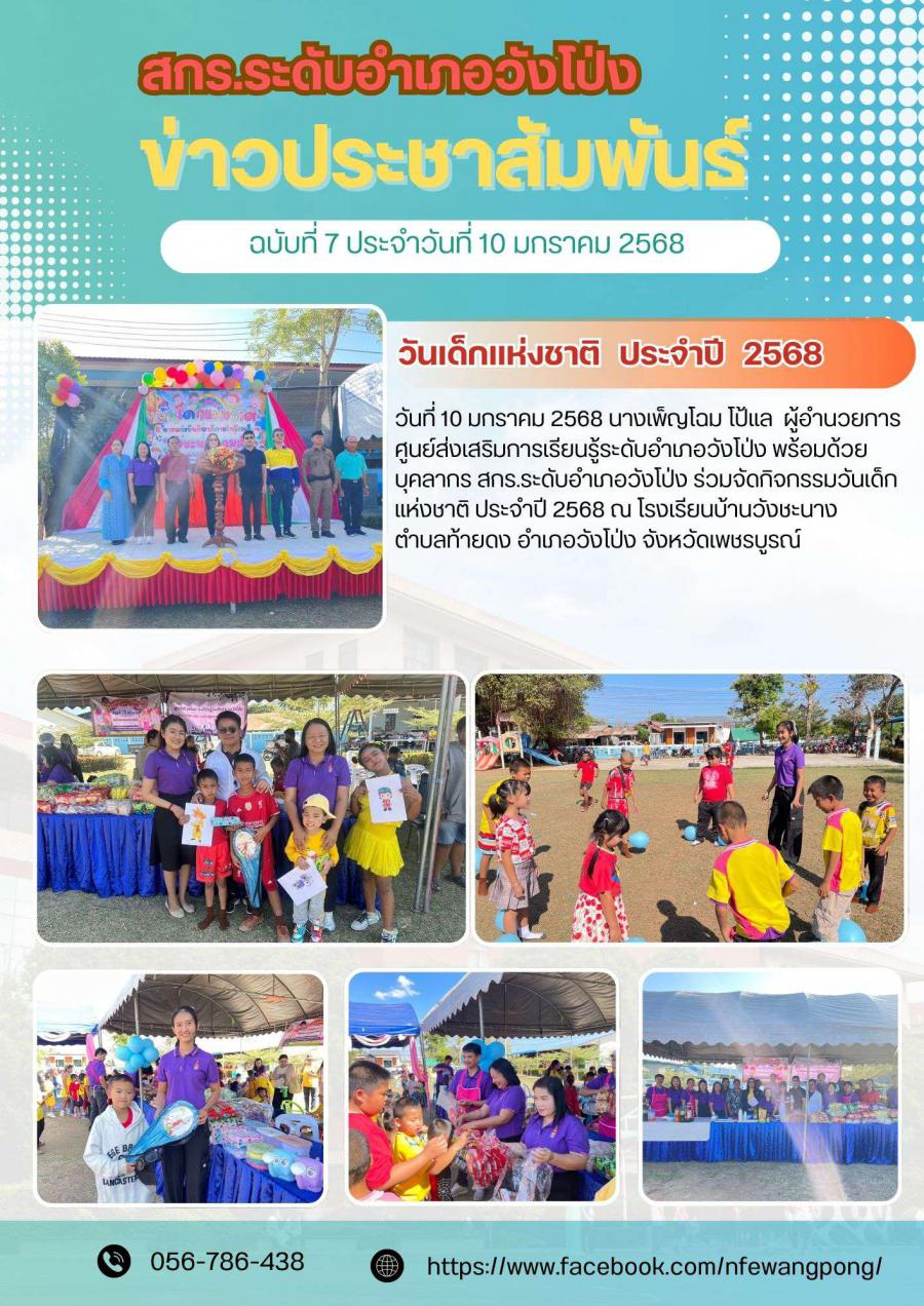 วันที่ 10 มกราคม 2568 นางเพ็ญโฉม โป้แล ผู้อำนวยการ ศูนย์ส่งเสริมการเรียนรู้ระดับอำเภอวังโป่ง พร้อมด้วยบุคลากร สกร.ระดับอำเภอวังโป่ง ร่วมจัดกิจกรรมวันเด็กแห่งชาติ ประจำปี 2568 ณ โรงเรียนบ้านวังชะนาง ตำบลท้ายดง อำเภอวังโป่ง จังหวัดเพชรบูรณ์