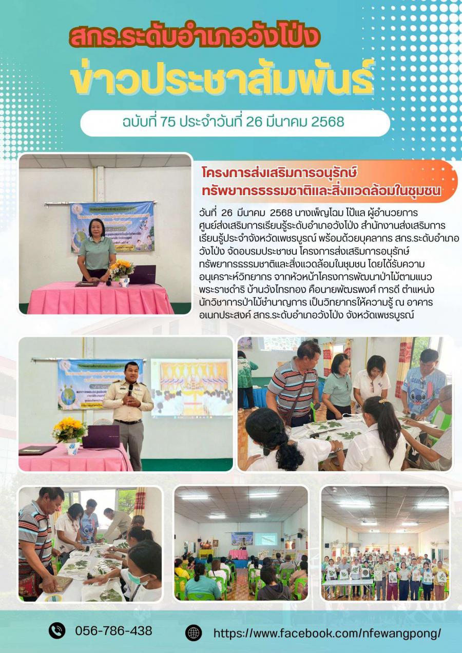 วันที่ 26 มีนาคม 2568 นางเพ็ญโฉม โป้แล ผู้อำนวยการศูนย์ส่งเสริมการเรียนรู้ระดับอำเภอวังโป่ง สำนักงานส่งเสริมการเรียนรู้ประจำจังหวัดเพชรบูรณ์ พร้อมด้วยบุคลากร สกร.ระดับอำเภอวังโป่ง จัดอบรมประชาชน โครงการส่งเสริมการอนุรักษ์ทรัพยากรธรรมชาติและสิ่งแวดล้อมในชุมชน โดยได้รับความอนุเคราะห์วิทยากร จากหัวหน้าโครงการพัฒนาป่าไม้ตามแนวพระราชดำริ บ้านวังไทรทอง คือนายพัฒธพงศ์ การดี ตำแหน่งนักวิชาการป่าไม้ชำนาญการ เป็นวิทยากรให้ความรู้ ณ อาคารอเนกประสงค์ สกร.ระดับอำเภอวังโป่ง จังหวัดเพชรบูรณ์