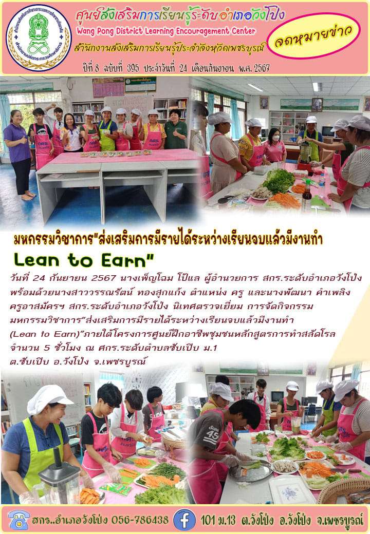 วันที่ 24 กันยายน 2567 นางเพ็ญโฉม โป้แล ผู้อำนวยการ สกร. ระดับอำเภอวังโป่ง มอบหมายให้นางสาววารุณี มะณีสอน ครู กศน ตำบล ดำเนินการจัดกิจกรรมการเรียนรู้เพื่อพัฒนาตนเอง รูปแบบกลุ่มสนใจ (5 ชั่วโมง) ภายใต้โครงการศูนย์ฝึกอาชีพชุมชน การจัดกิจกรรม มหกรรมวิชาการ “ส่งเสริมการมีรายได้ระหว่างเรียน จบแล้วมีงานทำ (Lean to Earn)” หลักสูตรการทำสลัดโรล ณ ศูนย์การเรียนรู้ตำบลซับเปิบ อำเภอวังโป่ง จังหวัดเพชรบูรณ์ พร้อมได้รับการนิเทศติดตามจากนางสาววรรณรัตน์ ทองสุกแก้ง ตำแหน่ง ครู นางสาวสุภัคชญา ทศไกร ตำแหน่ง ครู และนางพัฒนา คำเพลิง ครูอาสาสมัครฯ