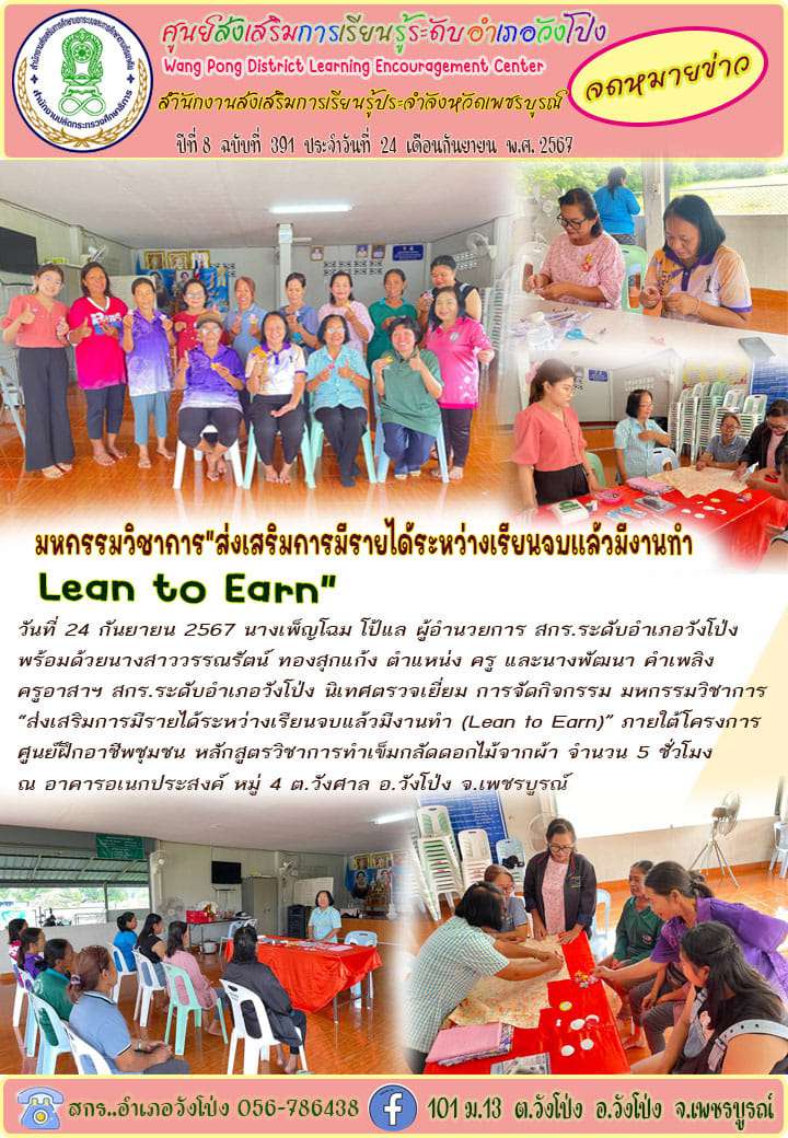 วันที่ 24 กันยายน 2567 นางเพ็ญโฉม โป้แล ผู้อำนวยการ สกร. ระดับอำเภอวังโป่ง มอบหมายให้นางสาวกาญจนา ศรีสอาด ครู กศน ตำบล ดำเนินการจัดกิจกรรมการเรียนรู้เพื่อพัฒนาตนเอง รูปแบบกลุ่มสนใจ (5 ชั่วโมง) ภายใต้โครงการศูนย์ฝึกอาชีพชุมชน การจัดกิจกรรม มหกรรมวิชาการ “ส่งเสริมการมีรายได้ระหว่างเรียน จบแล้วมีงานทำ (Lean to Earn)” หลักสูตรการทำเข็มกลัดดอกไม้จากผ้า ณ อาคารอเนกประสงค์ หมู่ 3ิ ตำบลวังศาล อำเภอวังโป่ง จังหวัดเพชรบูรณ์ พร้อมได้รับการนิเทศติดตามจากนางสาววรรณรัตน์ ทองสุกแก้ง ตำแหน่ง ครู นางสาวสุภัคชญา ทศไกร ตำแหน่ง ครู และนางพัฒนา คำเพลิง ครูอาสาสมัครฯ