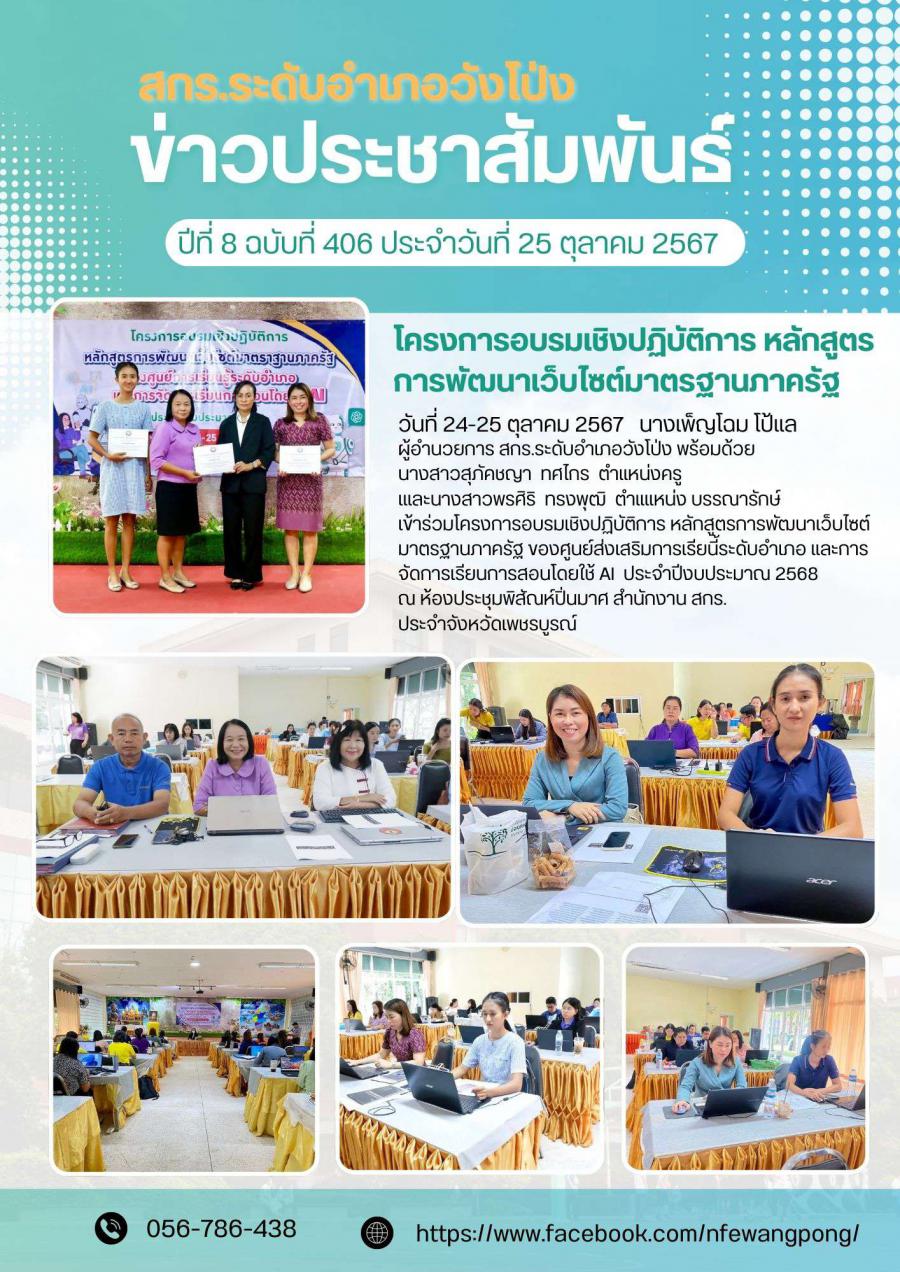 วันที่ 24-25 ตุลาคม 2567 นางเพ็ญโฉม โป้แล ผู้อำนวยการ สกร.ระดับอำเภอวังโป่ง พร้อมด้วยนางสาวสุภัคชญา ทศไกร ตำแหน่ง ครู และนางสาวพรศิริ ทรงพุฒิ ตำแหน่ง บรรณารักษ์ เข้าร่วมโครงการอบรมเชิงปฏิบัติการ หลลักสูตรการพัฒนาเว็บไซต์มาตรฐานภาครัฐ ของศูนย์ส่งเสริมการเรียนรู้ระดับอำเภอ และการจัดการเรียนการสอนโดยใช้ AI ประจำปีงบประมาณ 2568 ณ ห้องประชุมพิสัณห์ปิ่นมาศ สำนักงาน สกร.ประจำจังหวัดเพชรบูรณ์