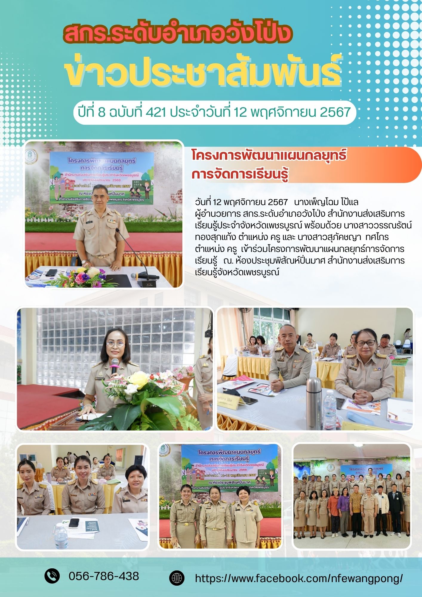 วันที่ 12 พฤศจิกายน 2567 นางเพ็ญโฉม โป้แล ผู้อำนวยการศูนย์ส่งเสริมการเรียนรู้ระดับอำเภอวังโป่ง พร้อมด้วย นางสาววรรณรัตน์ ทองสุกแก้ง ตำแหน่ง ครู และ นางสาวสุภัคชญา ทศไกร ตำแหน่ง ครู เข้าร่วมโครงการพัฒนาแผนกลยุทธ์การจัดการเรียนรู้ ณ ห้องประชุมพิสัณห์ปิ่นมาศ สำนักงานส่งเสริมการเรียนรู้จังหวัดเพชรบูรณ์